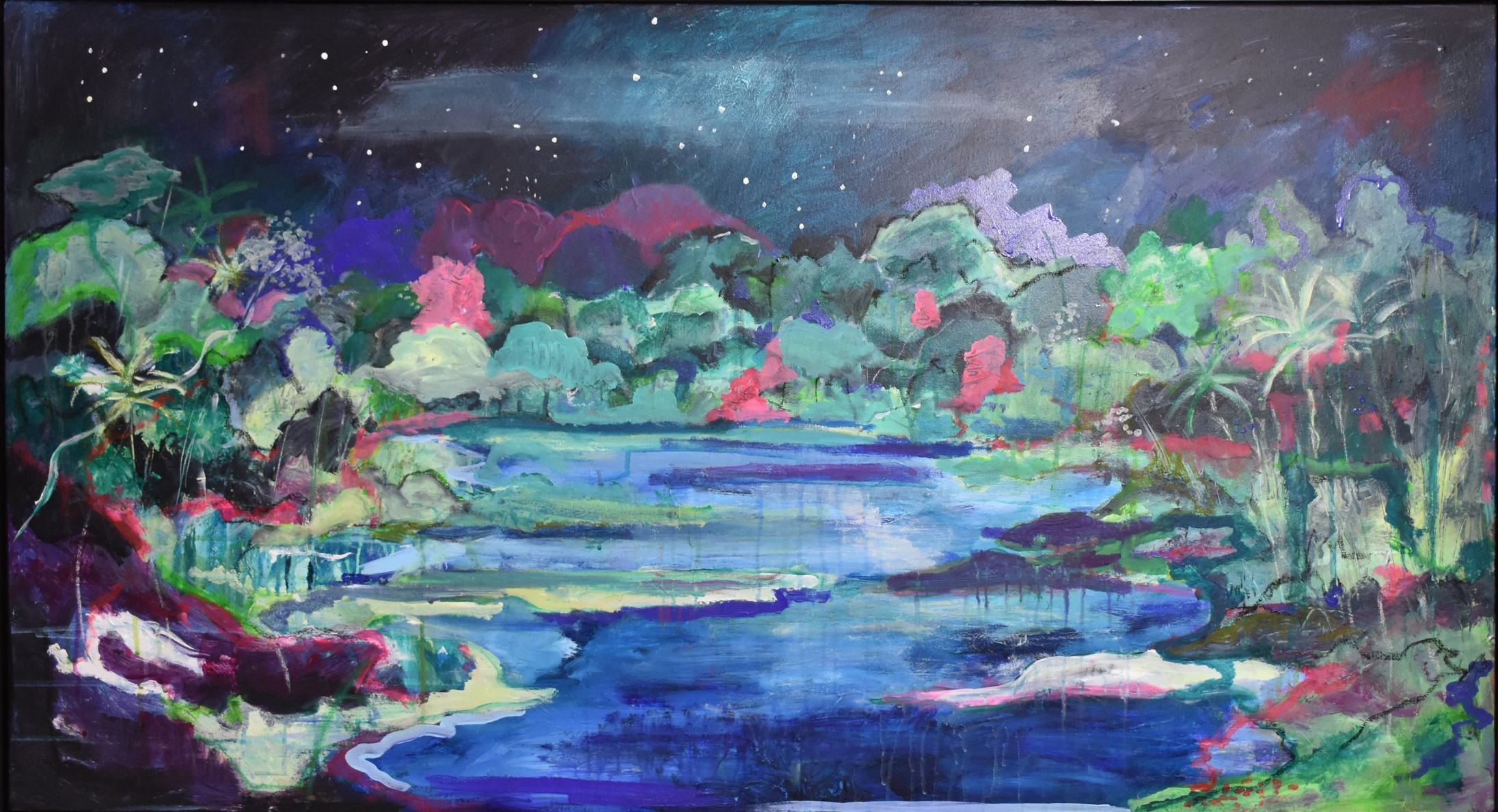 Ruth Bateman’s paintings are a rare encounter – Her mark-making resonates below language. You can almost feel the air shift: the shimmer of heat, the sound of crickets in the grass, stars flickering above a line of foliage. Scintillation, saturation, sensation.
