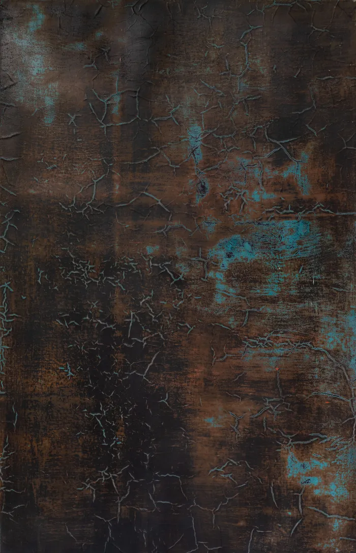 Andrew’s recent paintings draw on fragments of late-Victorian wallpaper from the V&A archive, chosen for their symbolism at the height of British imperial identity. These patterns, once decorative, are fractured, oxidised and buried beneath darkened glazes. Surface becomes structure, beauty is something earned.