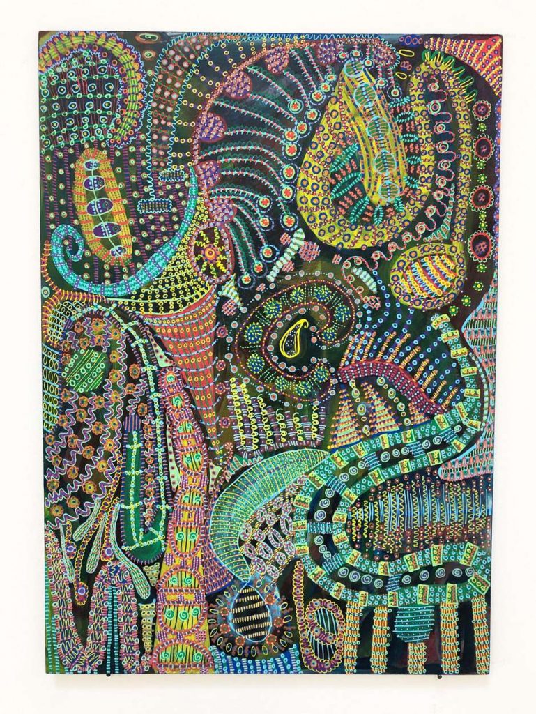 Made up of a compression of dots, dashes, and undulating lines, each richly calibrated piece invites the us to speculate, daring viewers to resist their spellbinding hypnotism. In celestial-like markings, the work brings up a barrage (or mirage) of associations – twisting paisleys, peacock feathers, fossilised shells and more seem to pulsate under the gaze. Both ornamental and refined, motifs collate as if the complexities of a cell structure had been viewed under a microscope.