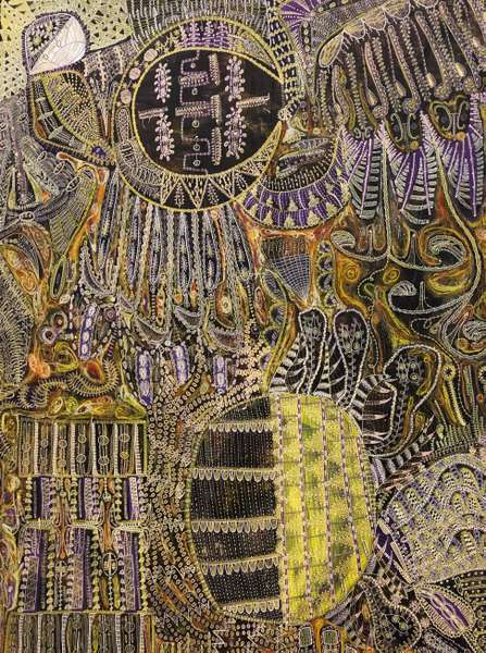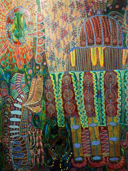 Made up of a compression of dots, dashes, and undulating lines, each richly calibrated piece invites the us to speculate, daring viewers to resist their spellbinding hypnotism. In celestial-like markings, the work brings up a barrage (or mirage) of associations – twisting paisleys, peacock feathers, fossilised shells and more seem to pulsate under the gaze. Both ornamental and refined, motifs collate as if the complexities of a cell structure had been viewed under a microscope.
