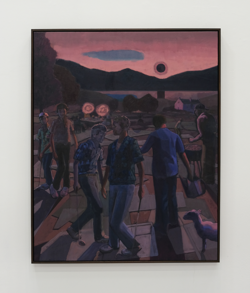 A midnight sun glows – black. A crazy golf course, uncoordinated figures moving with their clubs in different directions.