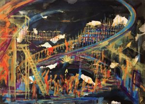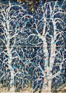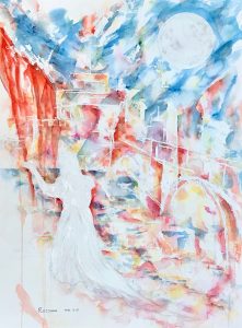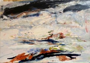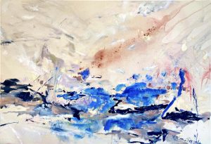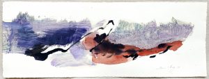With delicacy, through a restrained but vibrant palette, the painter gives an atmosphere’s chemical pigmentation. In this respect they recollect the super-temporality of Anselm Kiefer’s nature paintings. The paper gives an effect of softness: a transient scrolling, in particular in her horizontal works. In fact, these could be read from left to right, recalling antique painting scrolls.